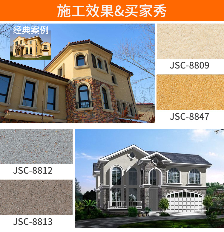 The following is a group of villa exterior wall construction case, is the use of three beautiful real stone paint products, villa building exterior wall preferred brand, for the construction is also very simple.