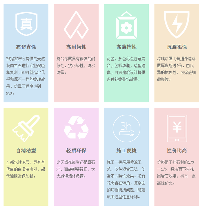 Three beautiful art colorful paint (also known as liquid granite paint) is a pure water, no pollution, rich in granite texture, high molecular element structure of high-end technology products. Compared with natural stone lacquer, granite lacquer and sandstone lacquer, it has completely different concept in essence and state. Spray-painted architectural products highlight the simplicity and beauty, elegant elegant; Granitic texture is natural and smooth, the surface is smooth, soft, feel smooth, coating tough, high adhesion, not cracking, high resistance to weather and temperature change, high resistance to pollution and easy cleaning, strong self-cleaning function. This technology not only originates from the idea of synthesis of architectural coatings, but also goes beyond the understanding of architectural coatings technology and technology, which is a major breakthrough in the manufacturing technology of architectural coatings.