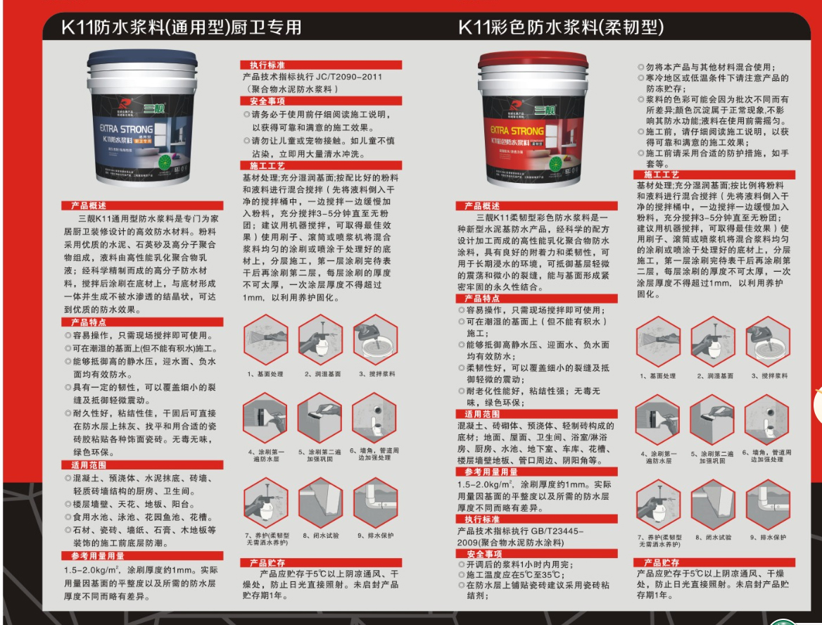 Three beautiful K11 general purpose waterproof paste is specially designed for the home kitchen and bathroom decoration of efficient waterproof material. The powder is made of high quality cement and quartz sand machine polymer, and the liquid is made of high performance emulsified polymer emulsion. The high polymer waterproof material that becomes through science delicate, agitate besmear is brushed on substrates, form an organic whole with substrates and generate the crystalline form that is not permeated by water, can achieve high grade waterproof effect.